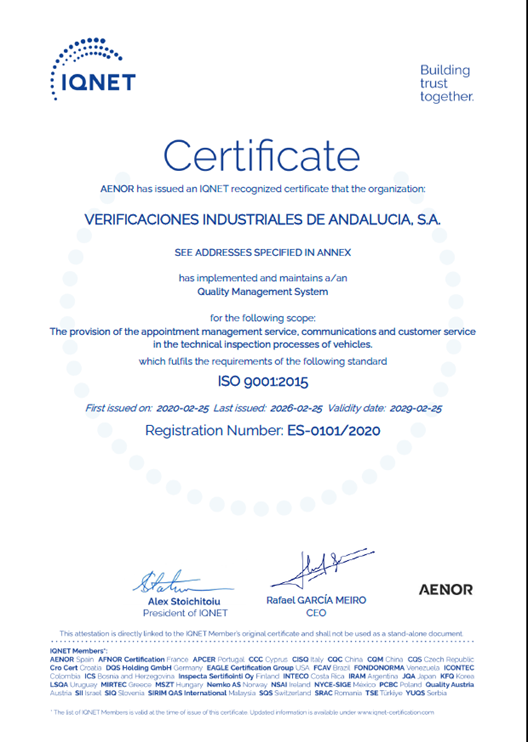 Además de ello, VEIASA cuenta con los certificados correspondientes de la asociación que agrupa a nivel internacional los principales organismos de certificación de cada país, IQNet: